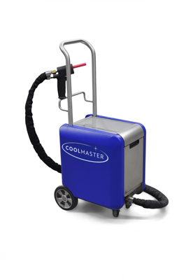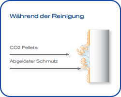 mittels Pistole und Düse auf das zu reinigende Objekt gestrahlt. Durch die entstehenden Miniexplosionen und den Kälteschock (-78,5°C) lösen sich Schmutzpartikel vom Untergrund.